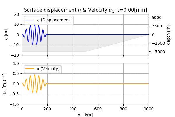 海底地形が変化する1次元線形浅水波の時間発展を計算します。