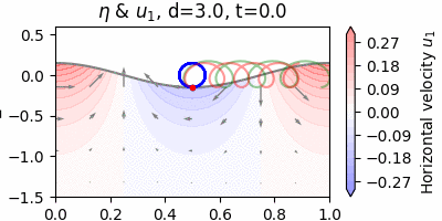 高次の効果も考慮すると波の進行方向に移動する様子が見えます。